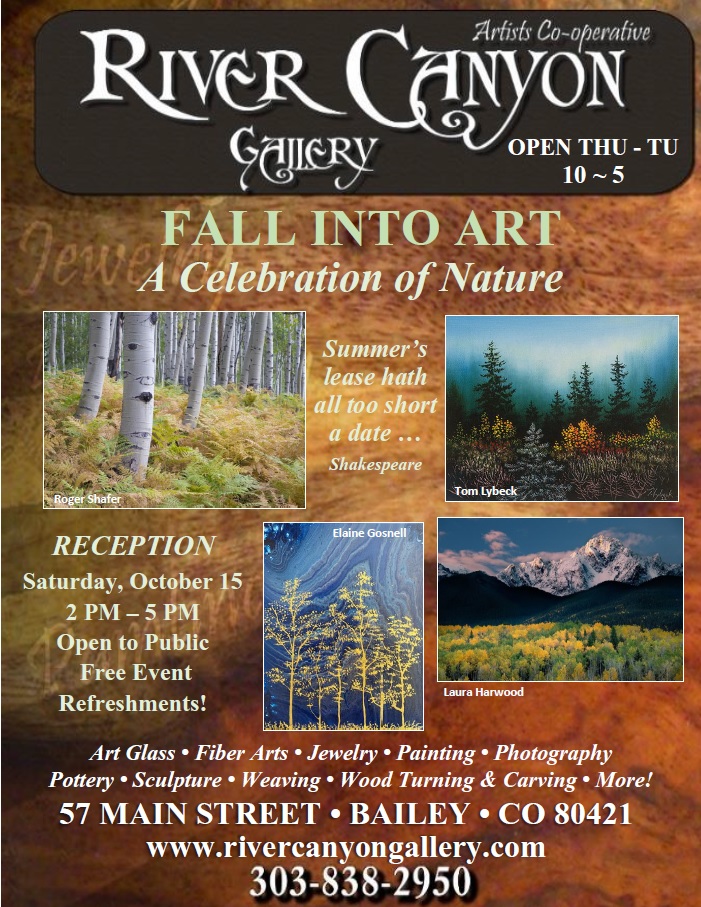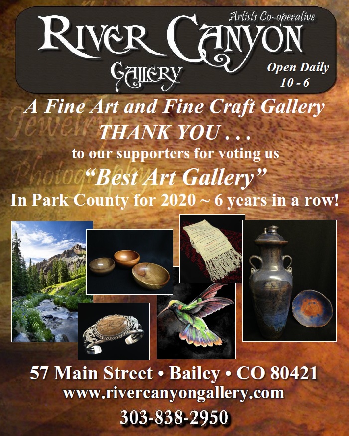 The River Canyon Gallery was founded in 2010 as a program under the umbrella of the Cultural Council of Park County. This local group of artists, sponsors of the arts, supporters from the Platte Canyon Area Chamber of Commerce and with a Small Steps grant from the Colorado Council of the Arts, were able to open the gallery doors in May 2010. The River Canyon Gallery artists represent a vast cross section of art and fine craft in media ranging from oil, watercolor and acrylic painting, photography, beading, jewelry, wood carving and turning, weaving, knitting, art glass, sculpture and pottery. Each artist brings a unique and creative style to the gallery that contributes to its overall character. In addition to the contributions that each artist provides to the River Canyon Gallery, many participate in art shows regionally, state-wide, and beyond. To find out more on any of our exceptional artists, visit their personal biography pages.